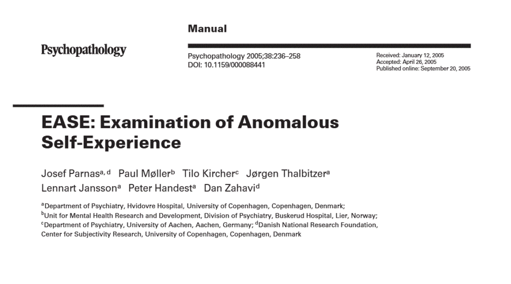The Examination of Anomalous Self-Experience (EASE) is a symptom checklist for semi-structured, phe- nomenological exploration of experiential or subjective anomalies ...